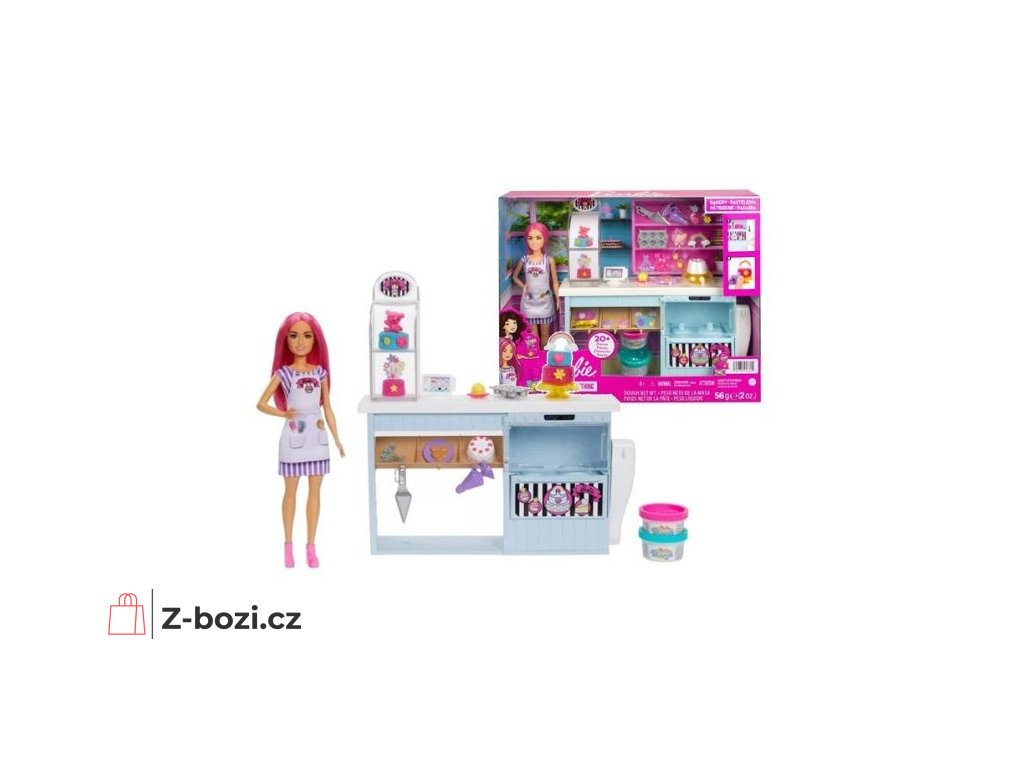 Sada obsahuje panenku Barbie® Baker s růžovými vlasy, která je oblečená do pruhované sukně a zástěry.