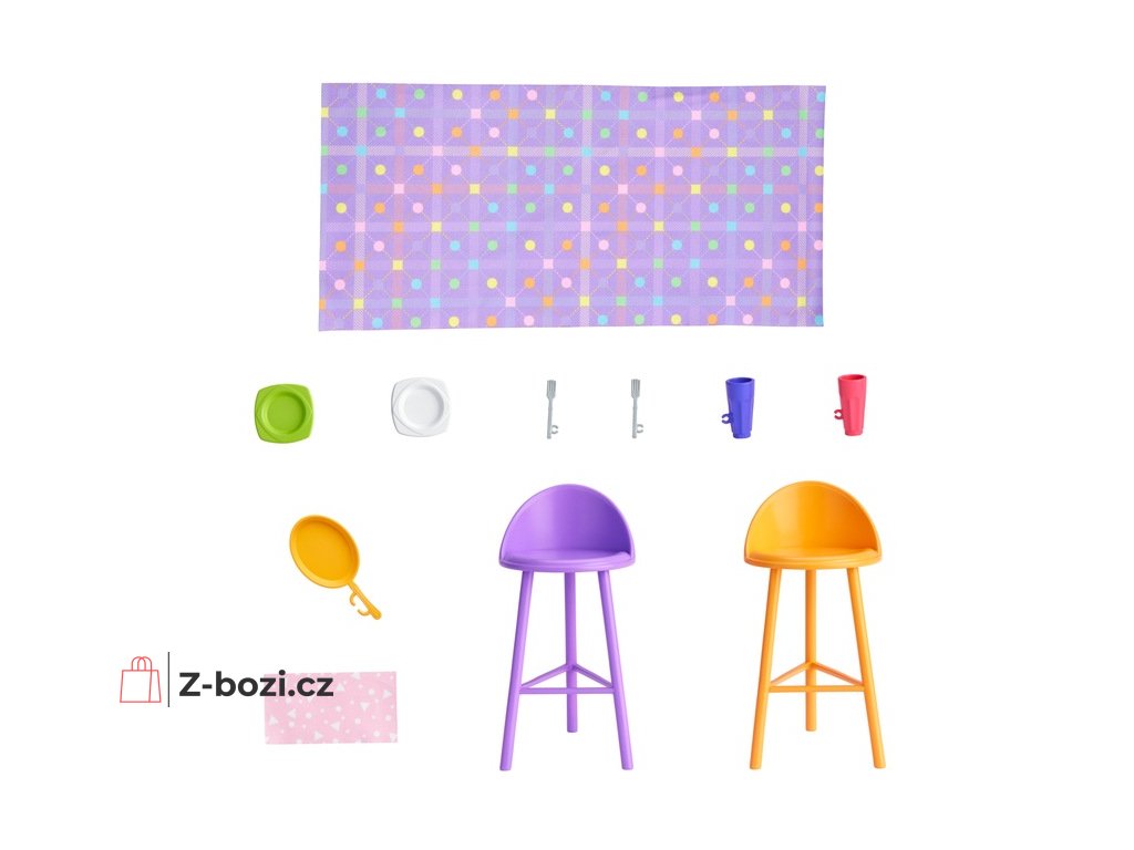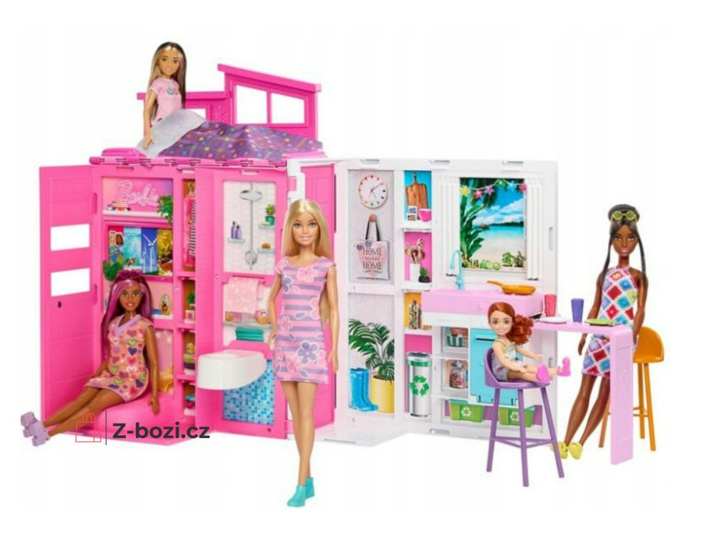 Domeček pro panenky má kuchyň s výsuvným stolem, koupelnu, ložnici v patře a útulný koutek pro filmové a herní večery.