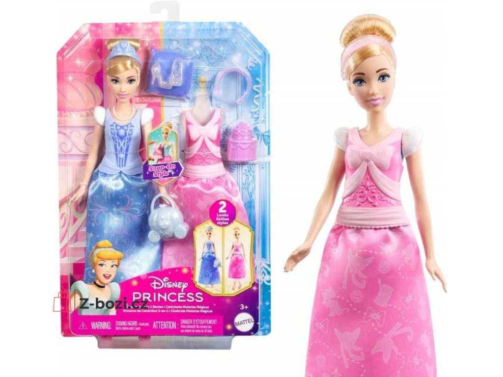 Panenku Popelky snadno obléknete do dvou připevněných korzetů a dvou sukní s motivy známými z jejího příběhu.